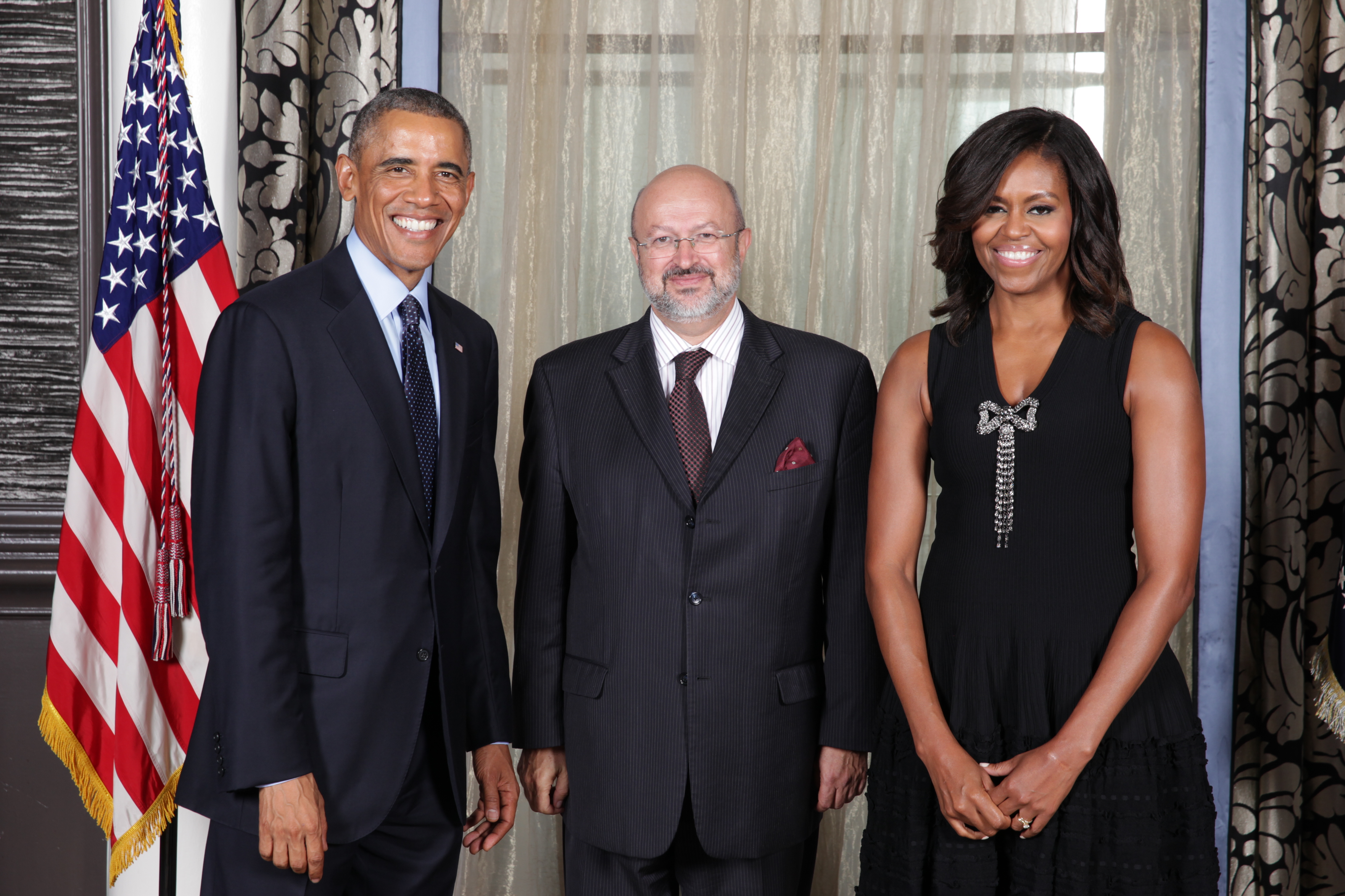 (L-r) US President Barack Obama, OSCE Secretary General Lamberto Zannier, and the First Lady of the US Michelle Obama during the United Nations General Assembly reception at the Waldorf Astoria Hotel in New York, N.Y., 23 September 2014.