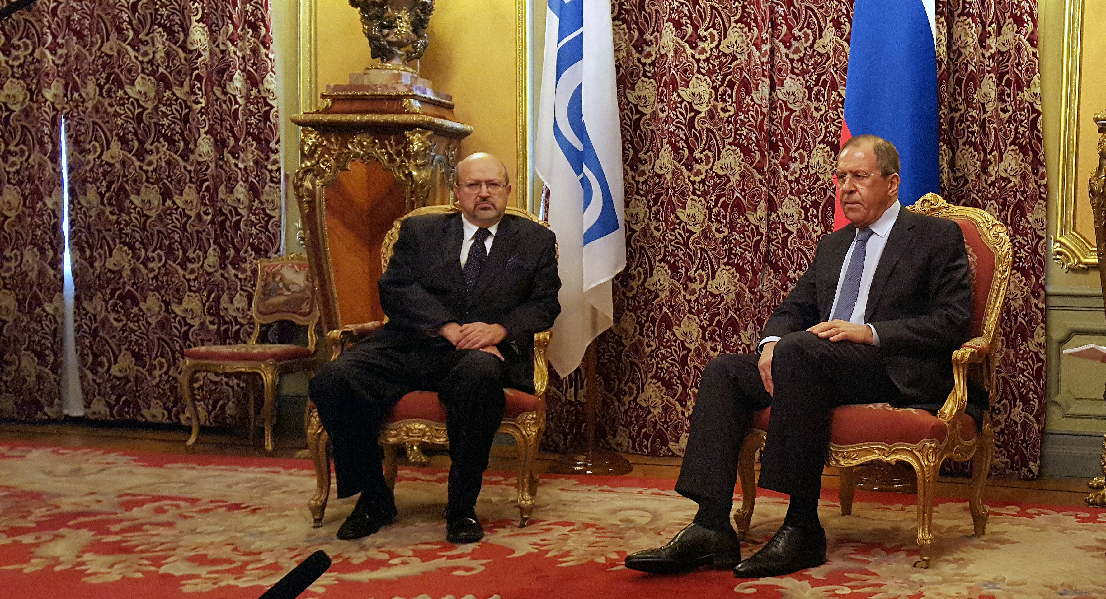 (l-r) OSCE Secretary General Lamberto Zannier at the the Moscow Conference on International Security discussing current security challenges with Russian Foreign Minister Sergey Lavrov, Moscow, 27 April 2016.