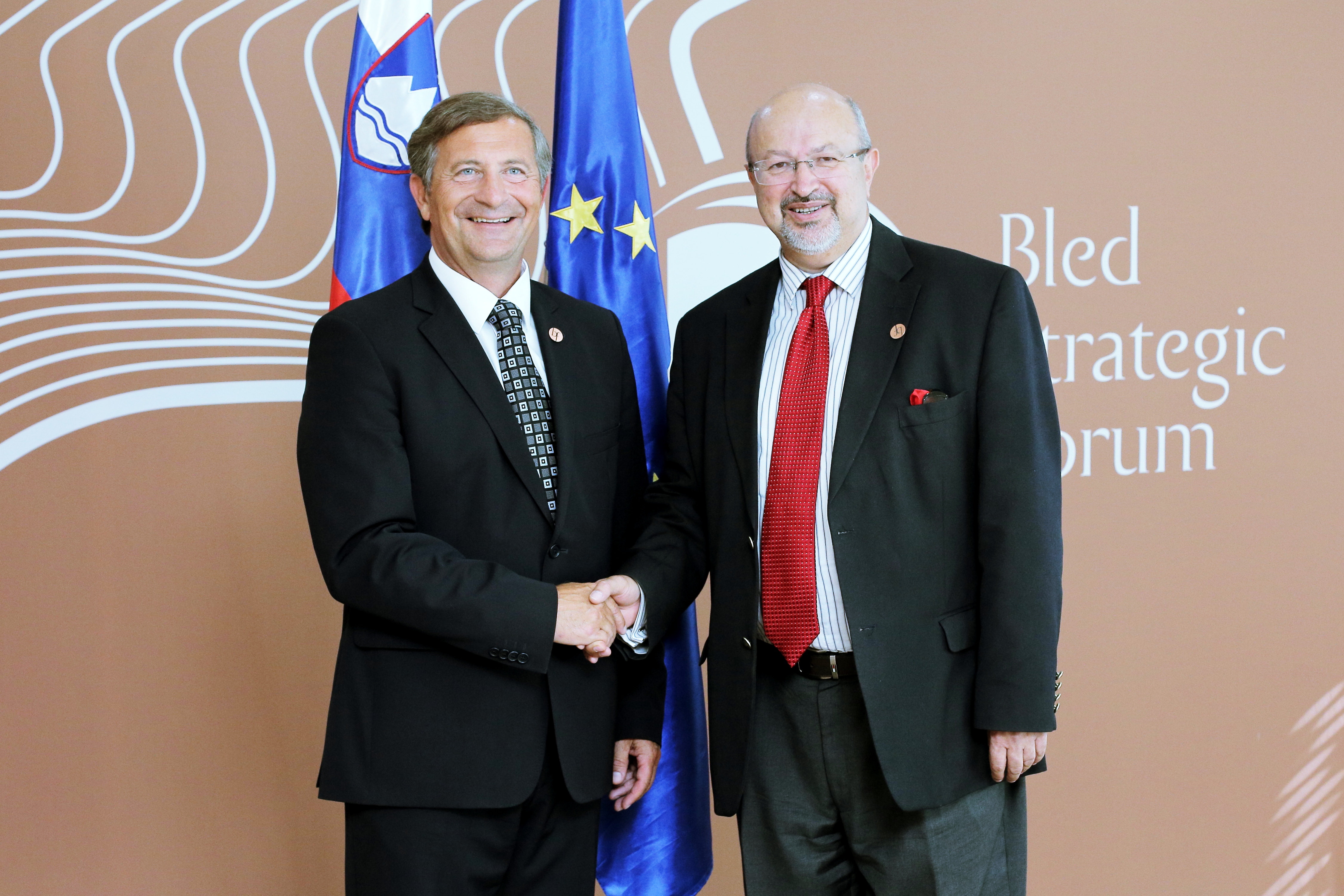 (L-r) Foreign Minister of Slovenia Karl Viktor Erjavec and OSCE Secretary General Lamberto Zannier at the Bled Strategic Forum, 5 September 2016.