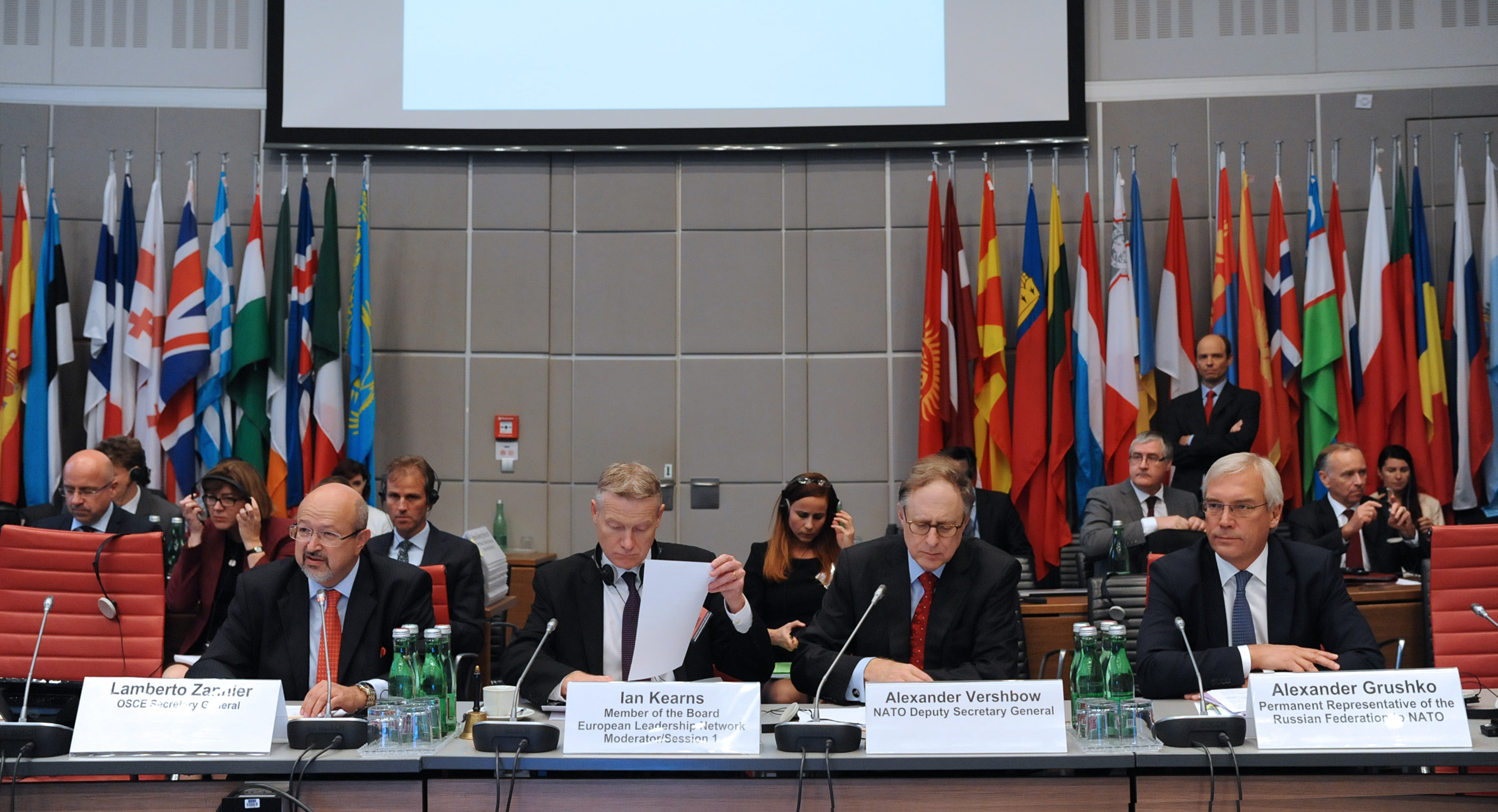 (l-r) OSCE Secretary General Lamberto Zannier, Ian Kearns, Member of the Board European Leadership Network, Alexander Vershbow, NATO Deputy Secretary General and Alexander Grushko, Permanent Representative of the Russian Federation to NATO at the OSCE Security Days, Vienna, 3 October 2016.