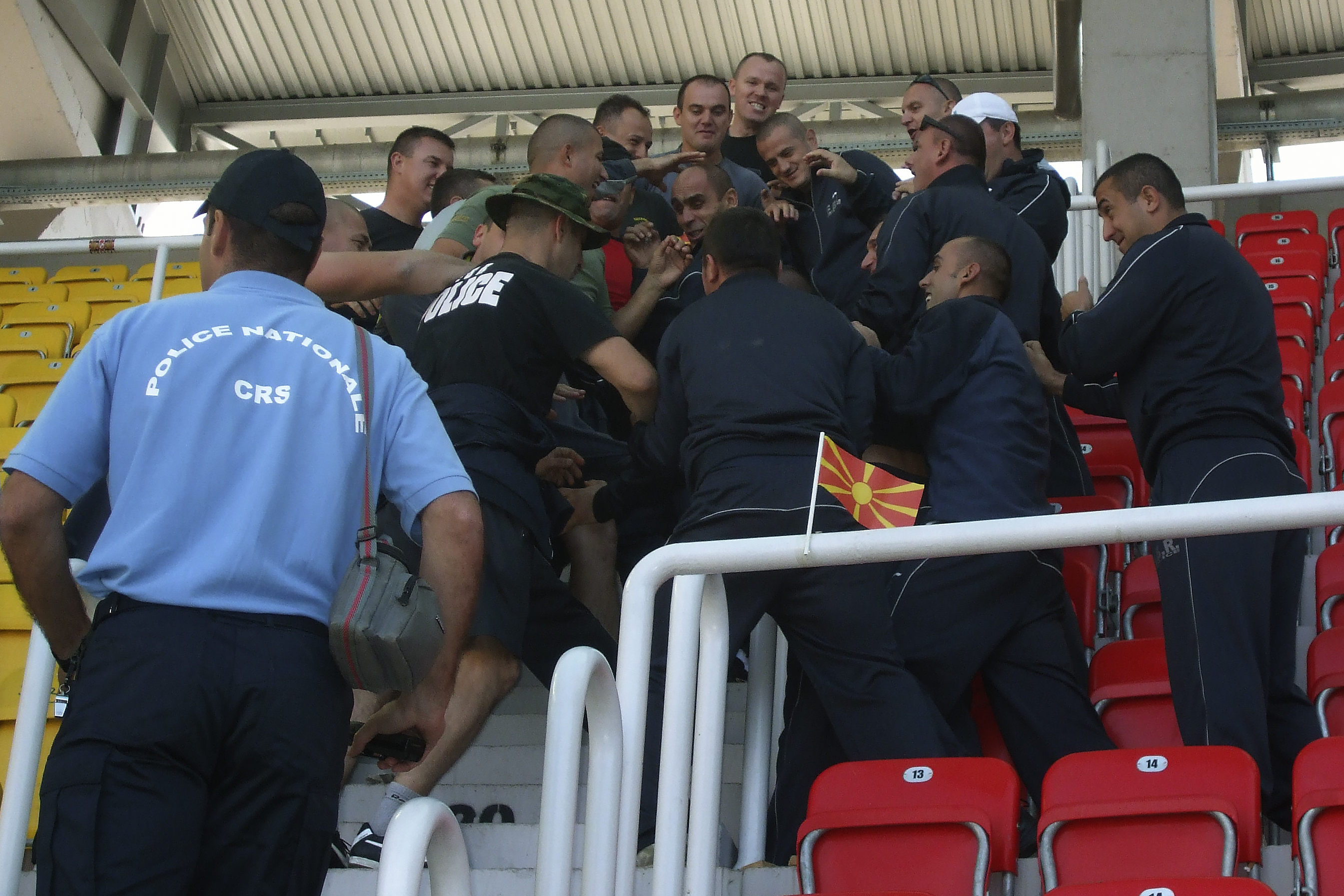 Officers from the national police's rapid-deployment unit take part in an OSCE-supported training exercise on the use of peaceful crowd-control techniques during public events, Skopje, 17 October 2012.