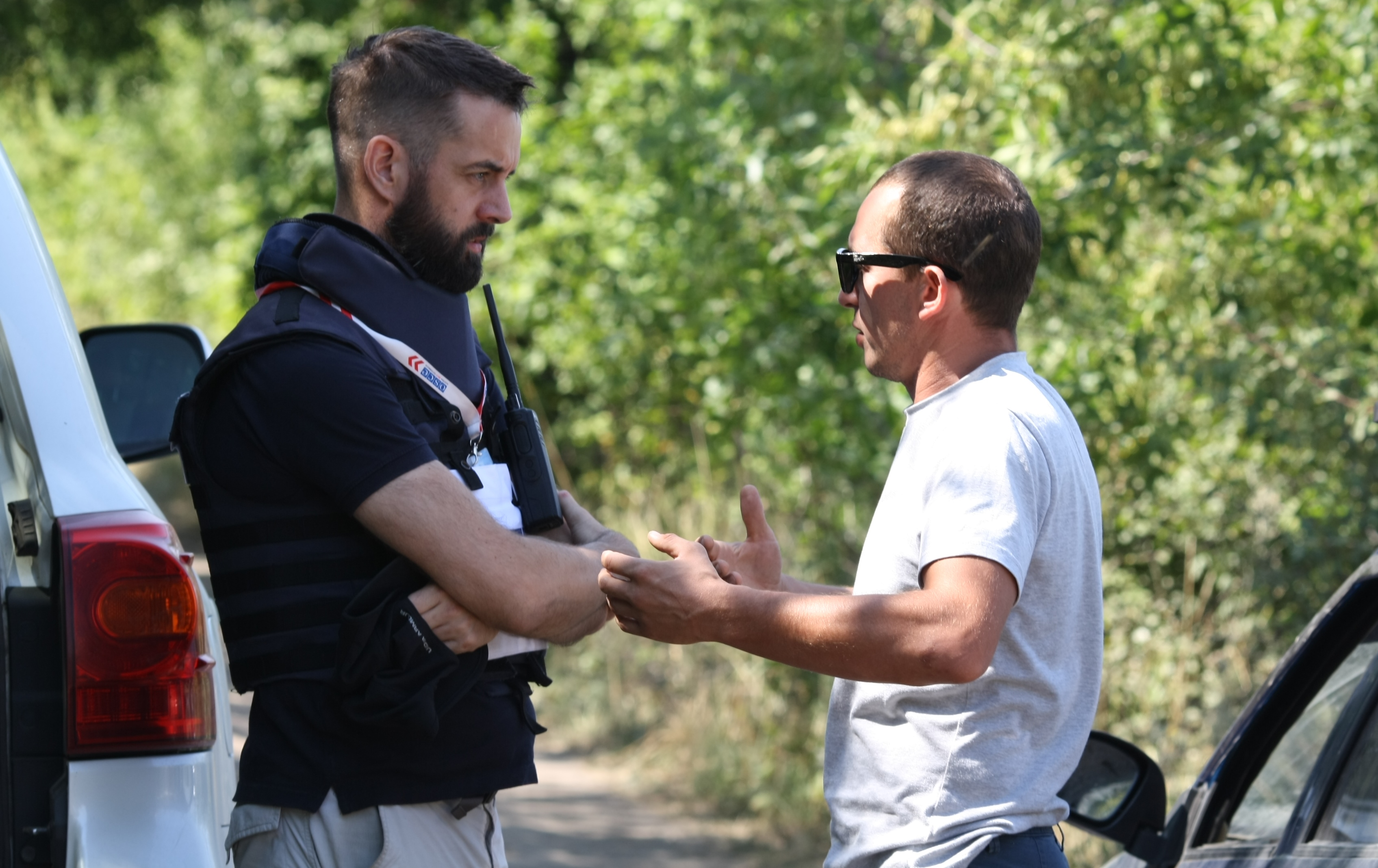 Kieran O’Reilly of the Delta 31 patrol speaks with an area resident in Vulhehirsk, Ukraine, 15 August 2017.