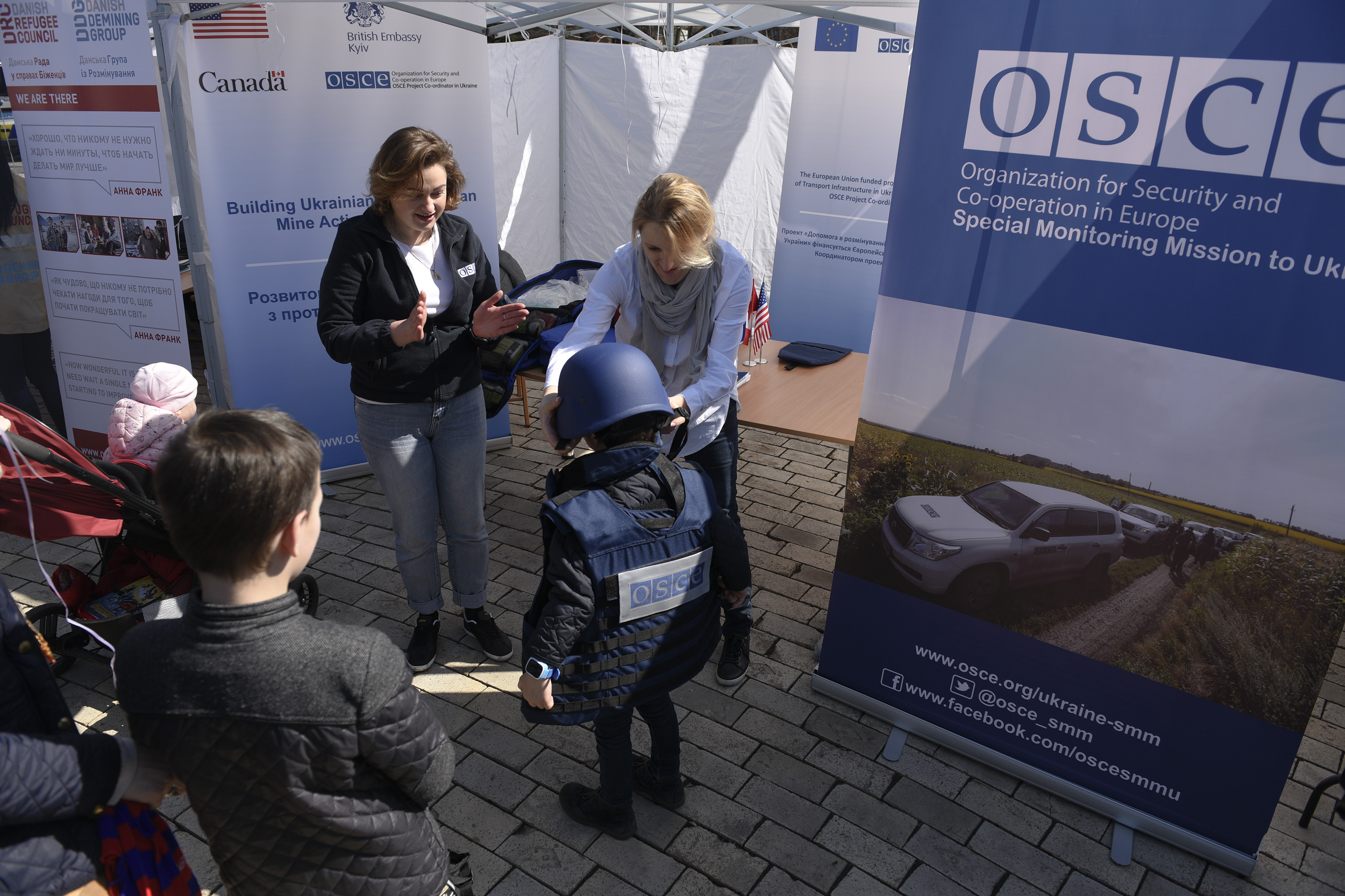 The staff of OSCE Project Co-ordinator and OSCE Special Monitoring Mission to Ukraine demonstrates the demining equipment during the Mine Awareness Day, Kyiv, 4 April 2018.