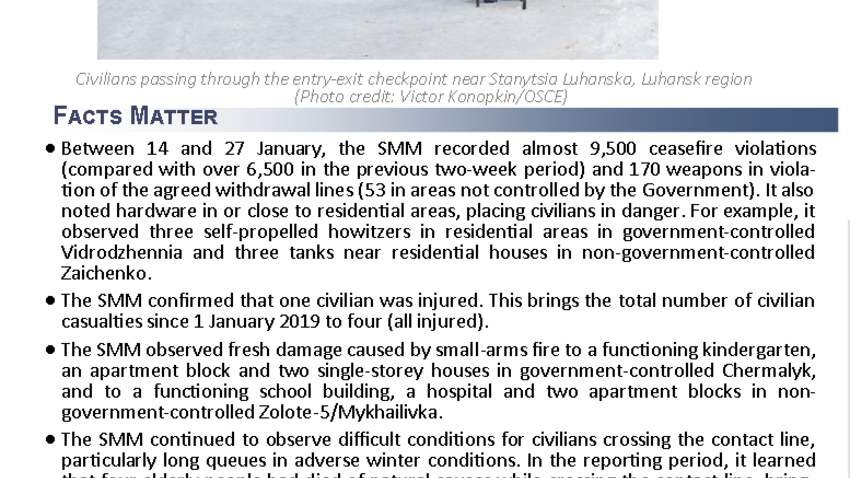 This report presents a general overview of the Special Monitoring Mission to Ukraine (SMM), its main activities and latest news as of 28 January 2019.