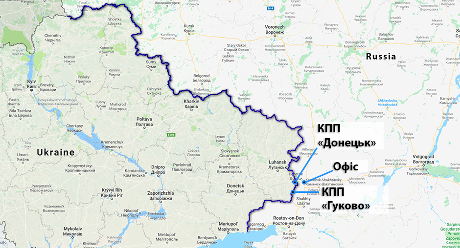 Мапа, на якій позначені російські пункти пропуску «Гуково» і «Донецьк», де знаходиться Місія спостерігачів ОБСЄ.
