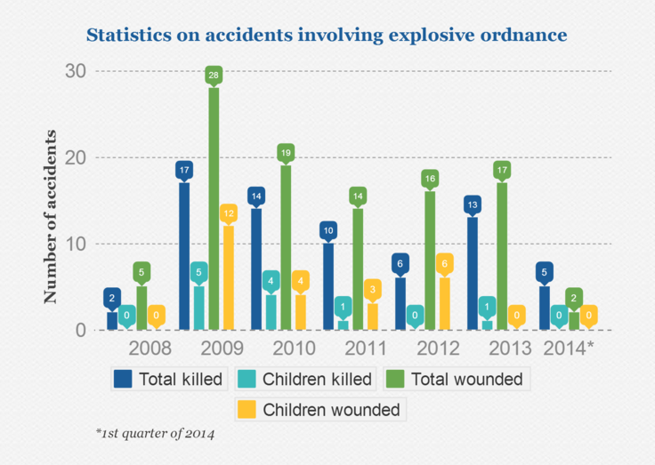 Due to economic hardship, many people search for and collect munitions on the sites of former military ranges, which lack adequate survey and clearance, for sale as scrap metal. Recovered explosives and fuses are also occasionally used in fish poaching. Handling these deadly materials is extremely dangerous. According to official statistics, in 2008-2013 62 people were killed and 98 were wounded in accidents involving the so-called “remnants of war”.