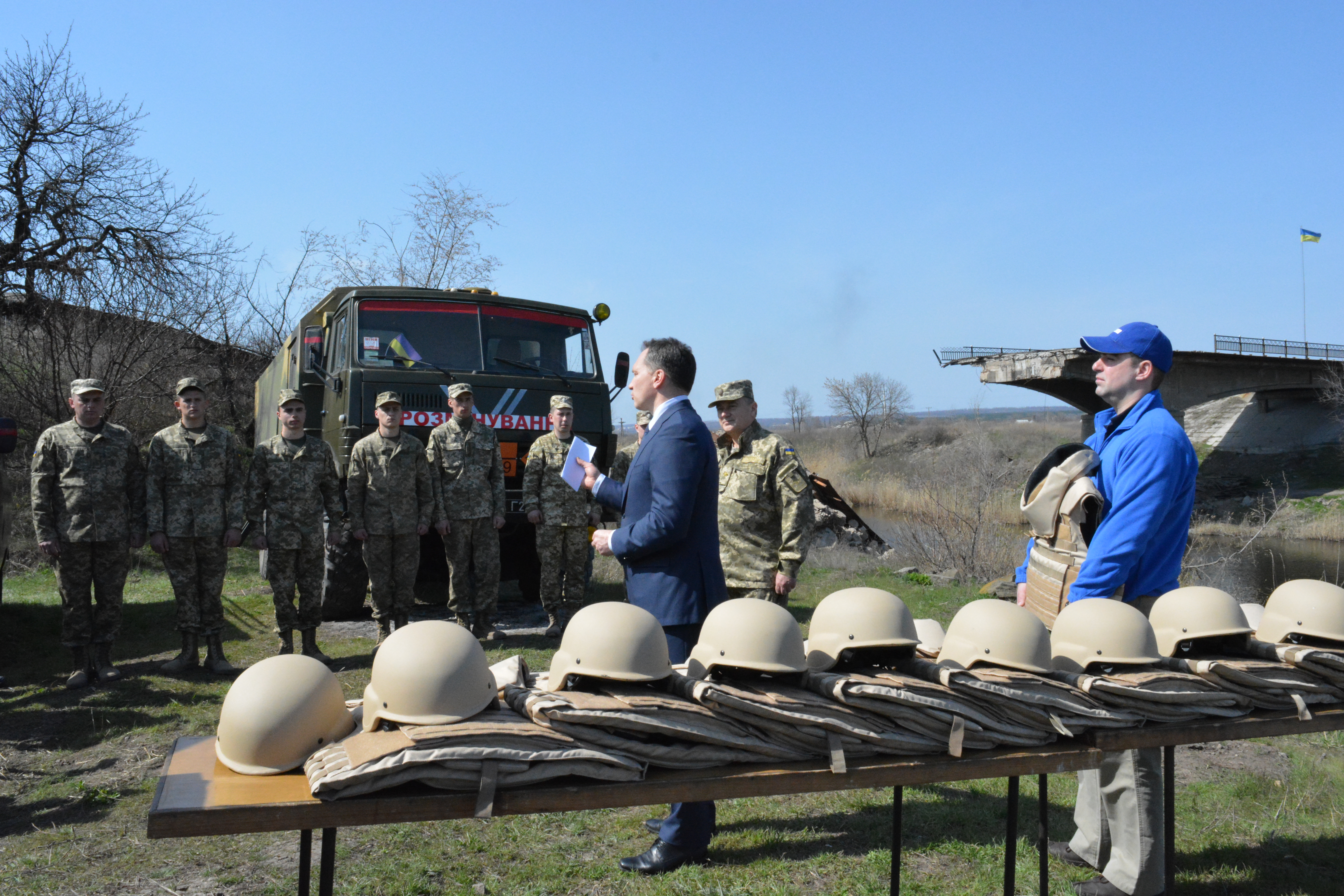 Ambassador Vaidotas Verba, the OSCE Project Co-ordinator (c) transfers protective equipment to civilian Ukrainian deminers at a ceremony near a destroyed bridge in Slovyansk, Eastern Ukraine. 7 April 2016